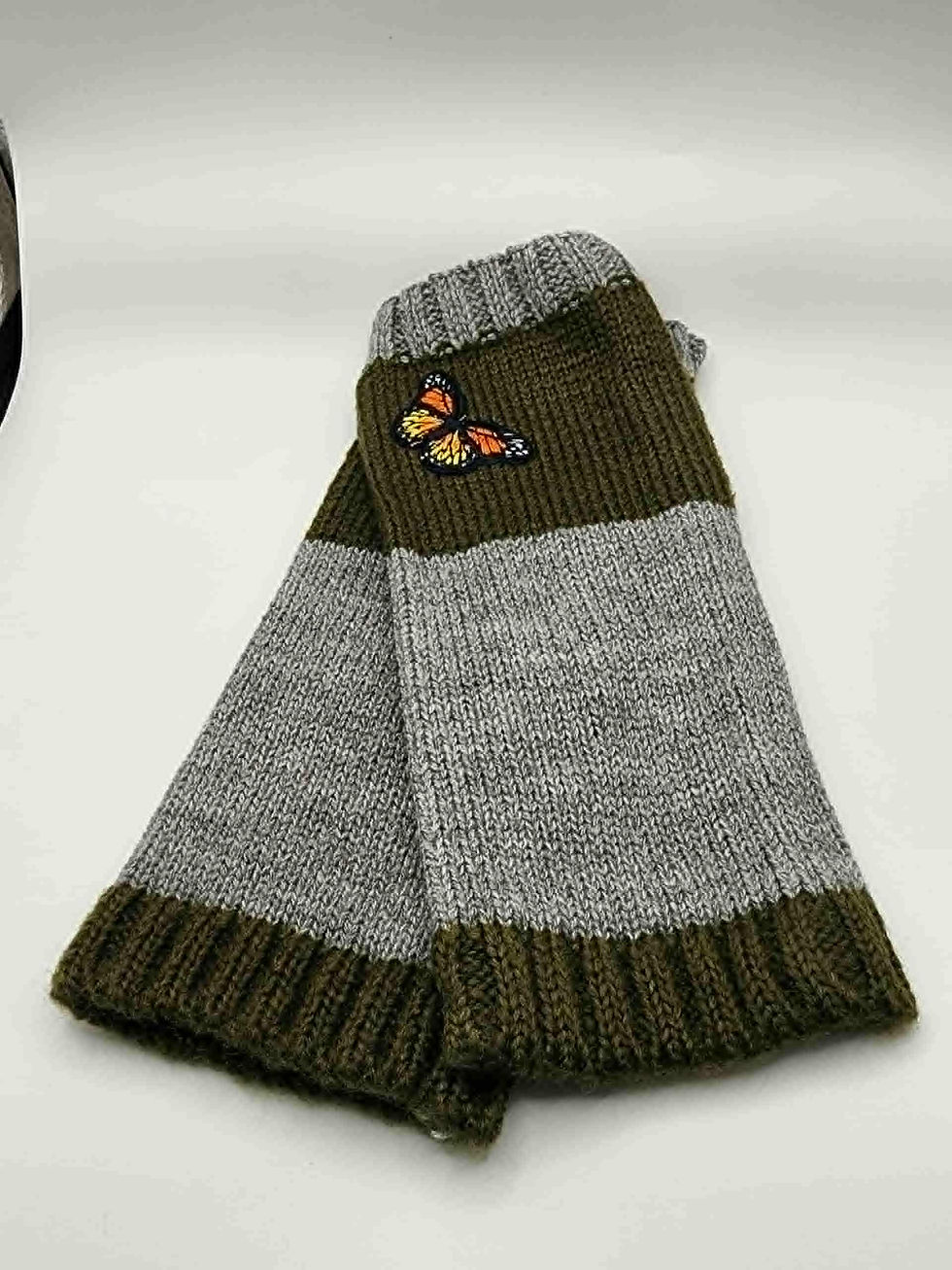 Green and Grey Monarch Butterfly Handwarmers – Cozy Knit Fingerless Gloves 🦋